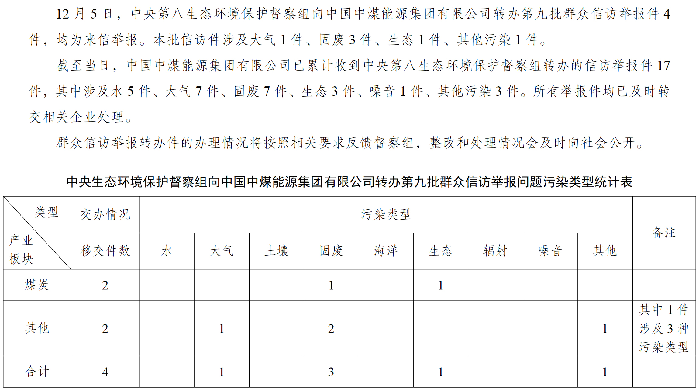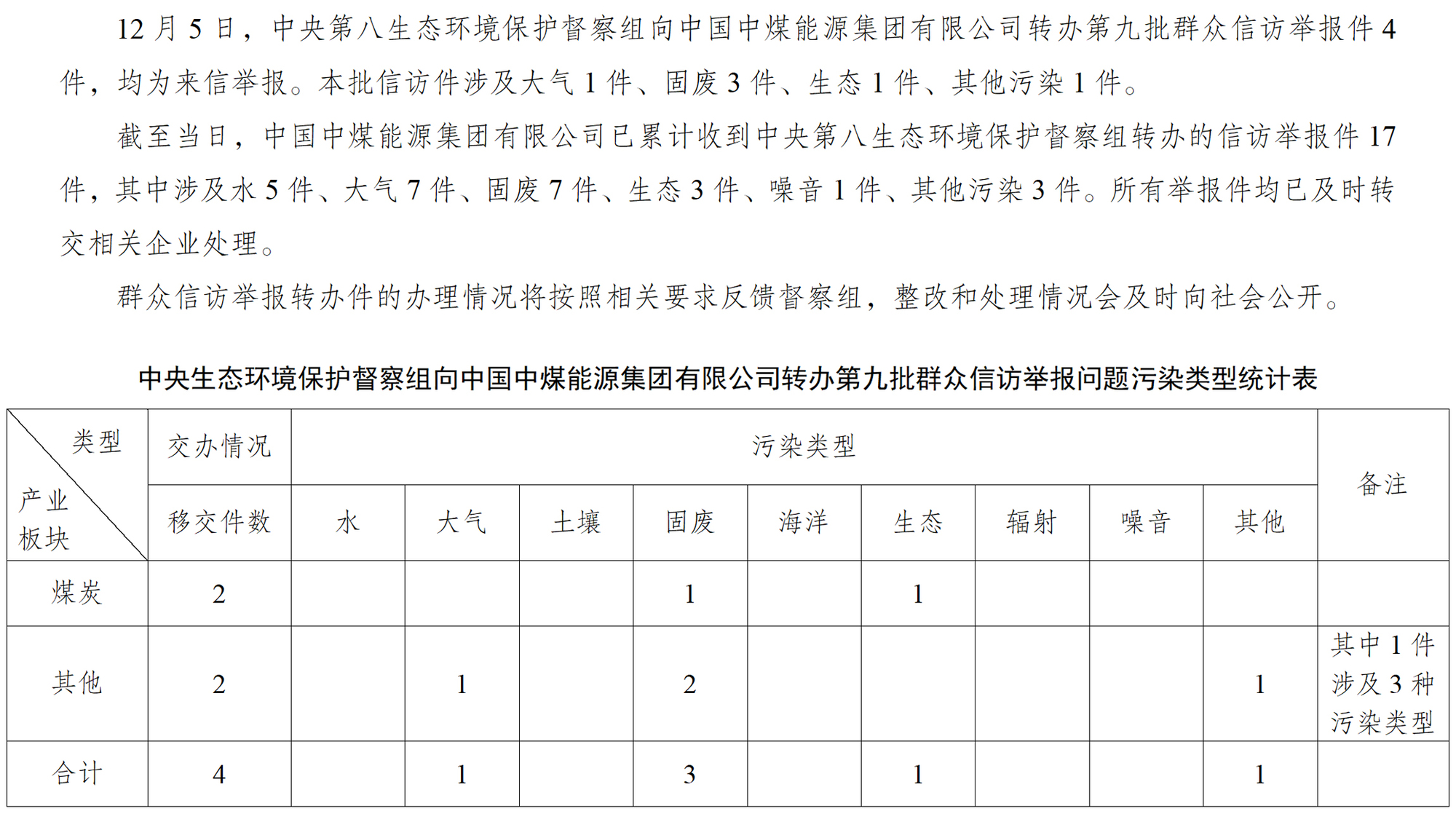 中央第八生態(tài)環(huán)境保護(hù)督察組向中國(guó)中煤能源集團(tuán)有限公司轉(zhuǎn)辦第九批群眾信訪舉報(bào)件