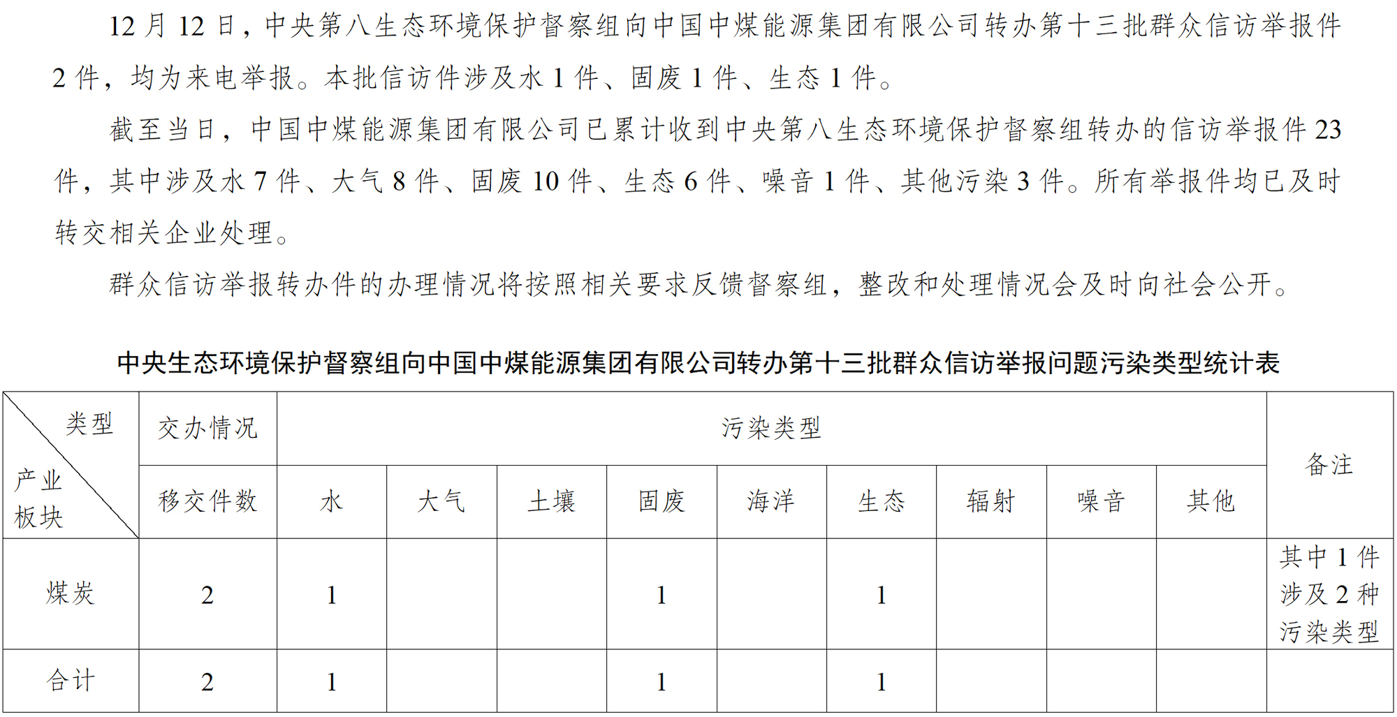 中央第八生態(tài)環(huán)境保護(hù)督察組向中國(guó)中煤能源集團(tuán)有限公司轉(zhuǎn)辦第十三批群眾信訪舉報(bào)件