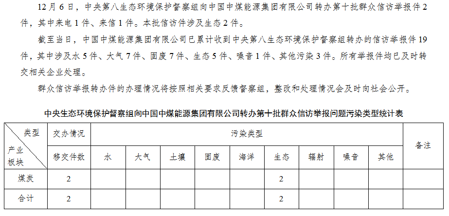 中央第八生態(tài)環(huán)境保護督察組向中國中煤能源集團有限公司轉(zhuǎn)辦第十批群眾信訪舉報件