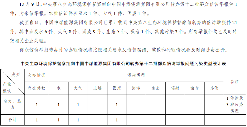 中央第八生態環境保護督察組向中國中煤能源集團有限公司轉辦第十二批群眾信訪舉報件