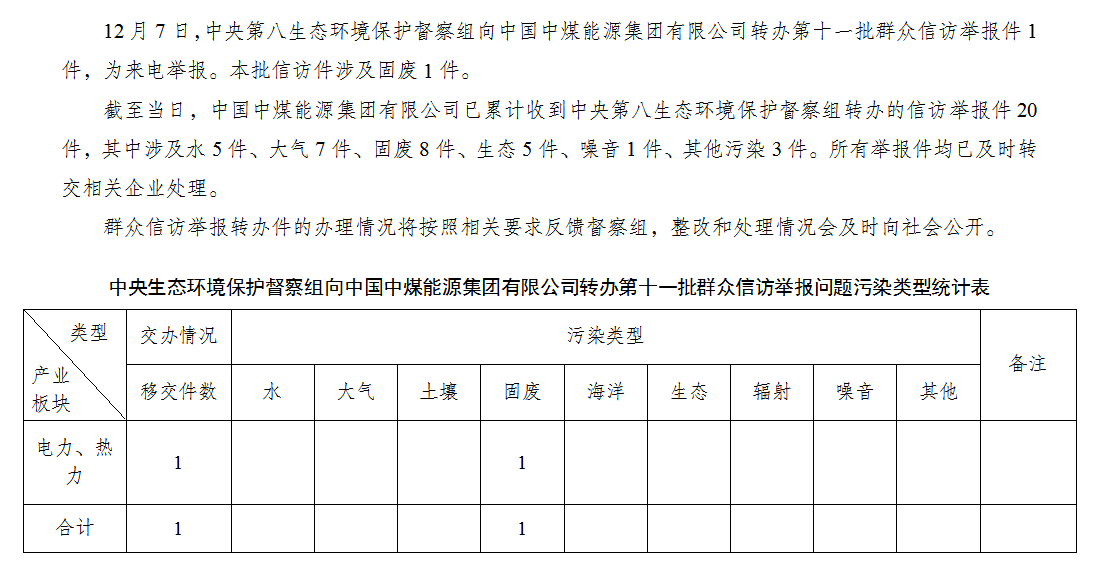 中央第八生態(tài)環(huán)境保護(hù)督察組向中國中煤能源集團(tuán)有限公司轉(zhuǎn)辦第十一批群眾信訪舉報(bào)件