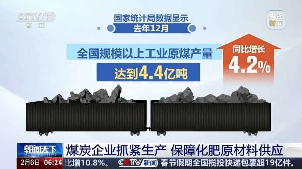 統計局數據顯示,去年12月,全國規模以上工業原煤產量達到4.4億噸,同比增長4.2%,2024年全年,規模以上工業原煤產量為47.6億噸,同比增長1.3%。原煤產量創歷史新高,為能源安全和化肥生產提供了有力保障。(央視新聞客戶端)